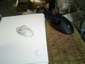 When I did the sketch above, I didn’t really know what to draw at first. I didn’t feel up to a life drawing yet, but didn’t want to draw fruit. So I looked around, and the trackball was handy.  It had interesting curves and shadows. So I tried it, and it came out pretty good. I surprised myself.  For the first time, I think I can really do this.