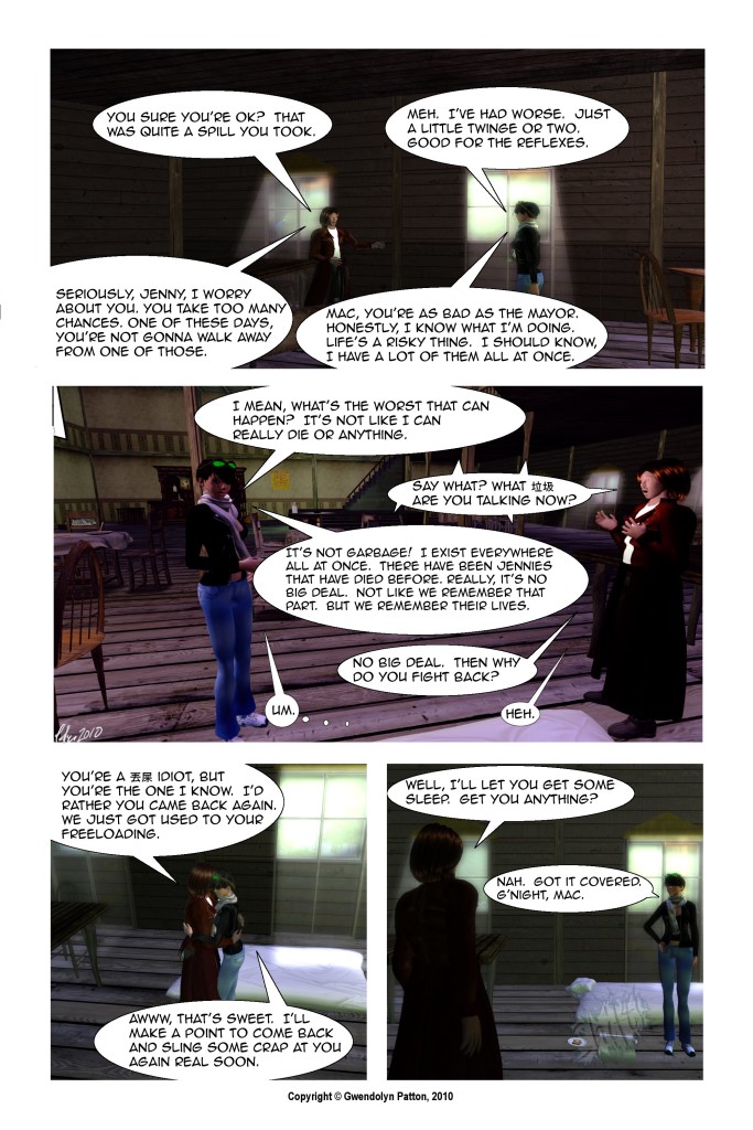 If anyone can’t figure out why Mac knows what’s going on, go back a couple of pages, and you’ll see that Jenny is talking in her sleep.